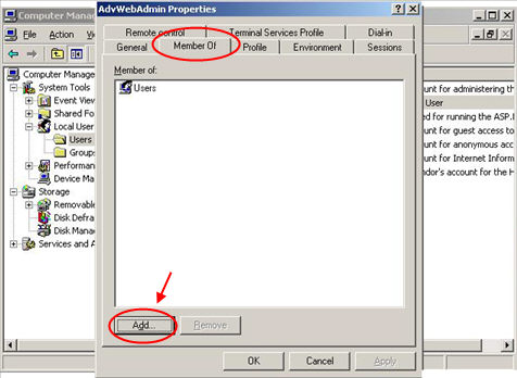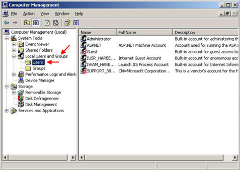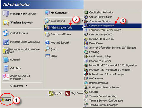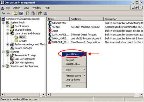 To add an anonymous user go to Start >> Administrative Tools >> Computer Management as shown: