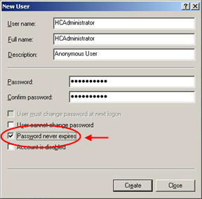 Specify the required information and select Password never expires option. Select "Create" to add the HCAdministrator and updates the list of existing users, accordingly as shown below: