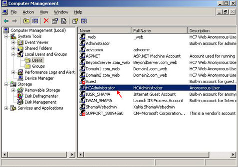 The right pane shows the existing users. Right click to add HCAdministrator as shown: